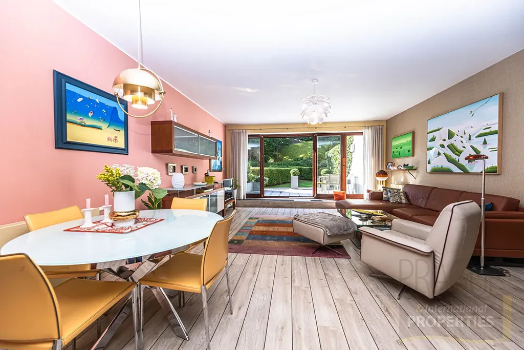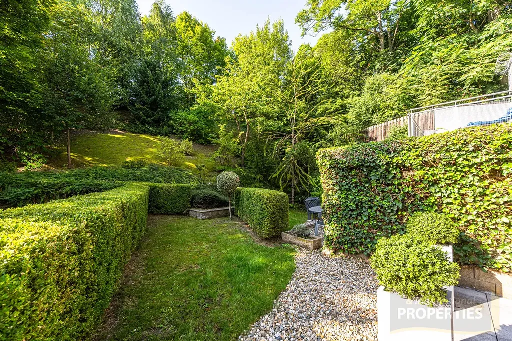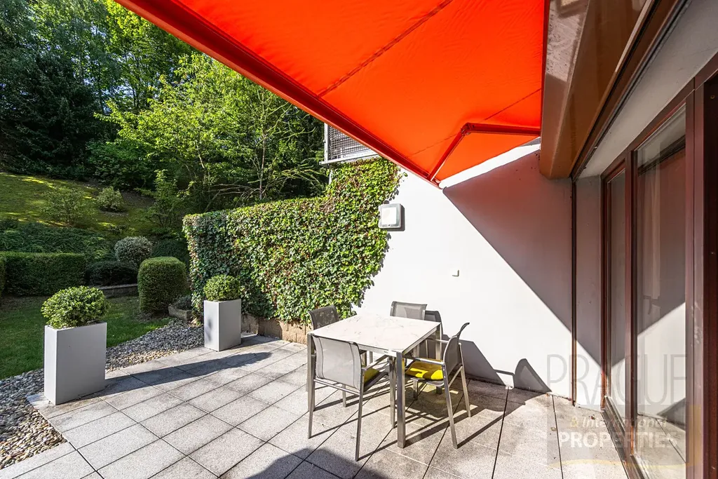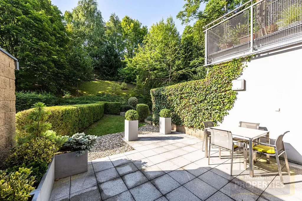 V přízemí bytu se nachází prostorná vstupní hala se šatnou, samostatná toaleta a velkorysý obývací pokoj s kuchyňským koutem, odkud je přímý vstup na terasu a do soukromé zahrady s nádherným výhledem do lesoparku.