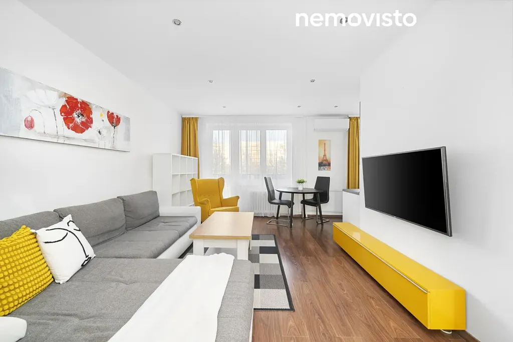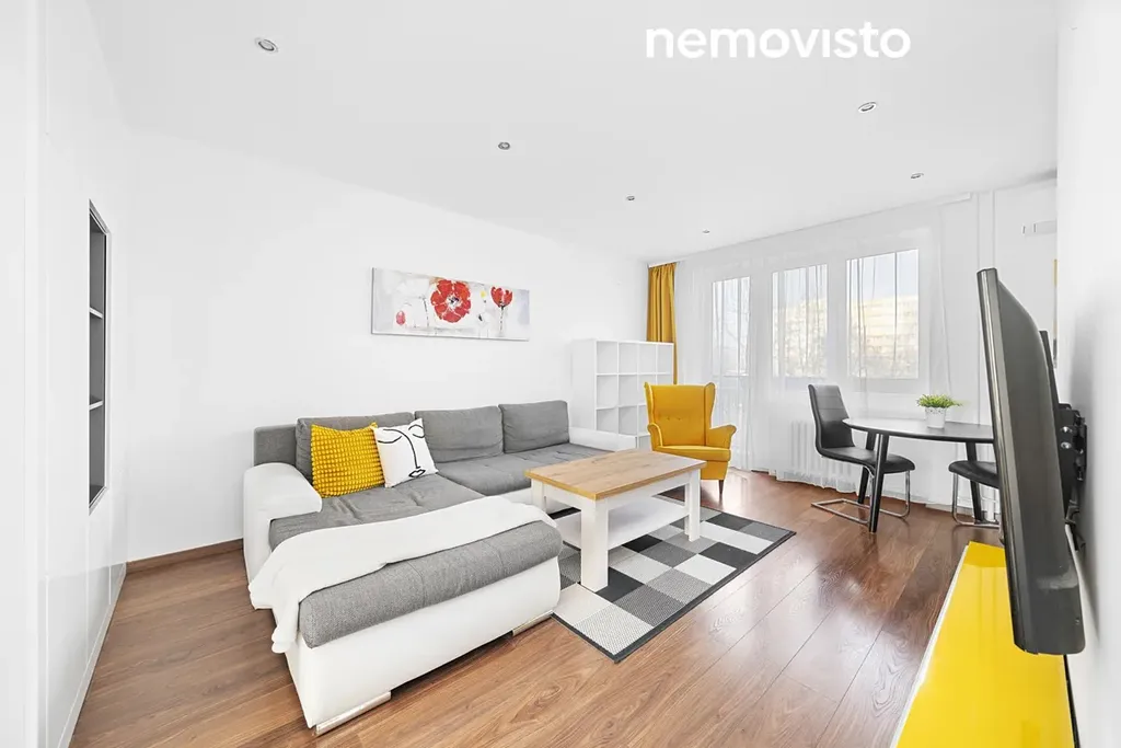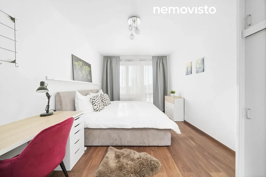 Byt má krásnou koupelnu s rohovou vanou. V chodbě jsou praktické vestavěné šatní skříně a botník. Ložnice je vybavena kvalitní postelí, nechybí ani šatní skříně a navíc máte přístup na druhý balkón. Obývací pokoj je vybaven sedací soupravou a televizí. Poslední pokoj je vybaven skříní a pracovním stolem a momentálně tak slouží jako pracovna. Vybavení bytu odpovídá fotografiím.