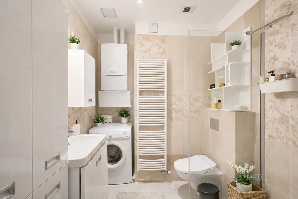 Dispozice bytu je velmi praktická — jednotlivé místnosti jsou propojeny chodbou, ze které je vstup do koupelny se sprchovým koutem a WC, a také do samostatné šatny/komory, která nabízí další vítaný úložný prostor. V koupelně je k dispozici pračka. Vytápění bytu zajišťuje vlastní plynový kotel.
