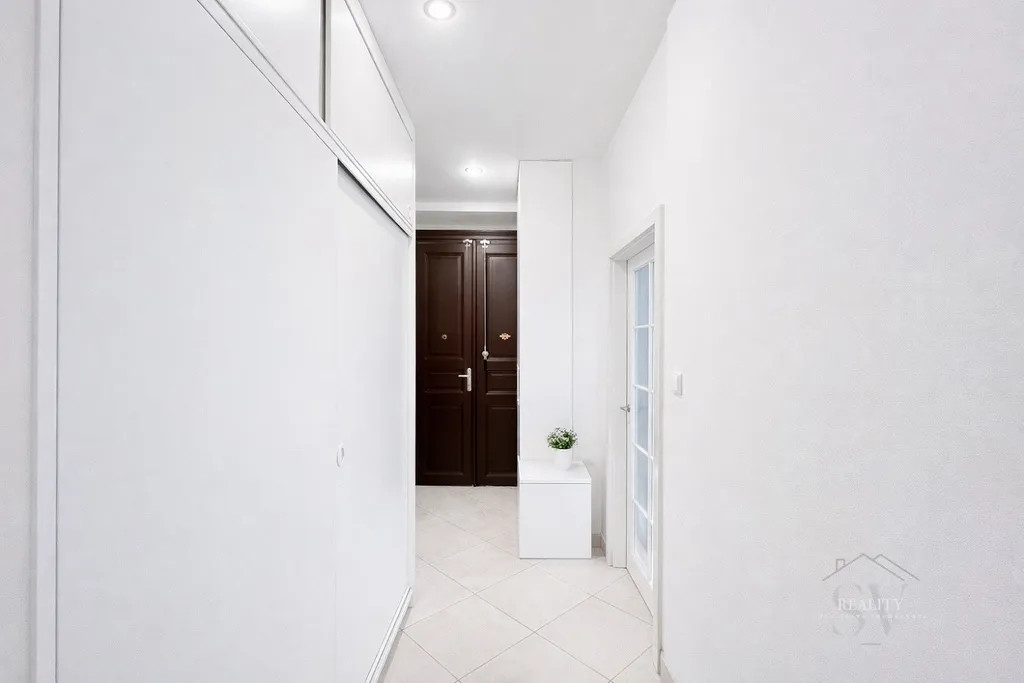 Vstupní chodba/hala disponuje velkou vestavěnou skříní, další zrcadlová skříň je v obývacím pokoji a v ložnici zůstává kvalitní policová stěna na míru. Kuchyňský kout je vybaven menší vestavěnou lednicí a dvouplotýnkou.