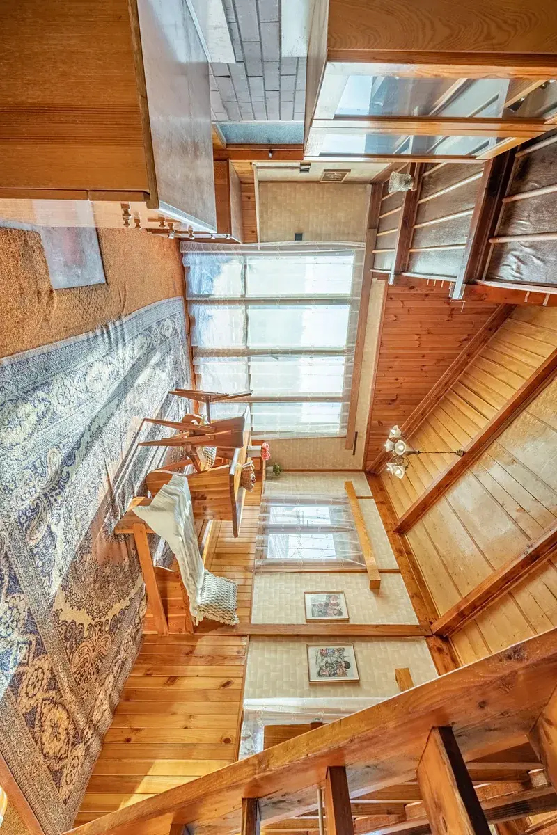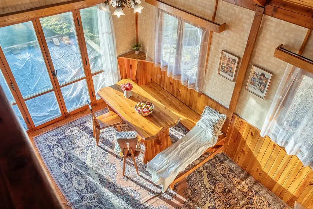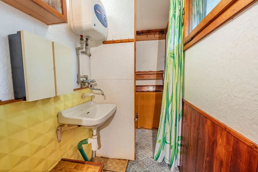 V přízemí je v celé ploše umístěna garáž kombinovaná s dílnou a komorou. V prvním patře, kam se vchází přes balkón je chodba, kuchyně, obývací pokoj a malá ložnička s palandami a terasa s výhledem přes údolí. V tomto patře je také příslušenství - wc s umyvadlem (sprcha zde aktuálně není). Do podkroví vedou dřevěné schody na galerii nad obývákem a tam najdeme dvě ložnice. Všechny místnosti mají okna.