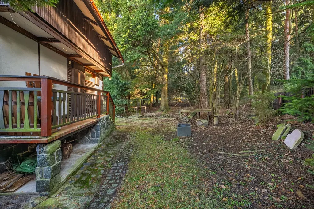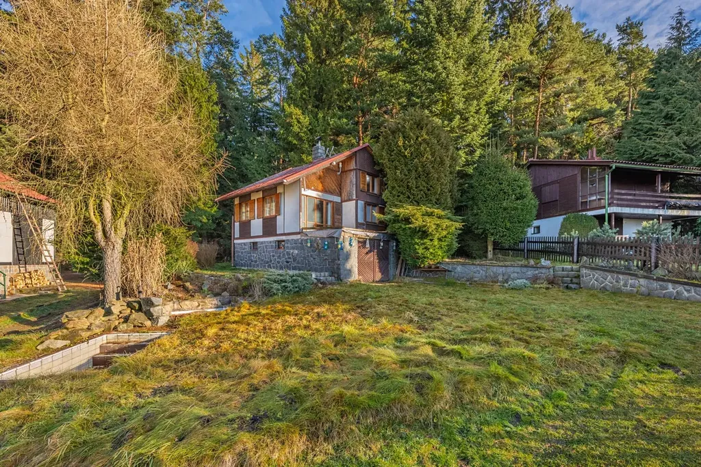 Chata je umístěna v mírném svahu s jihozápadní orientací štítu a výhledem do údolí na rybníček a protější kopec. Celkový pozemek je 348m2 a přímo za chatou je již les. Na zahradě před chatou je parkování ve vjezdu do garáže.