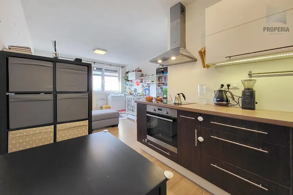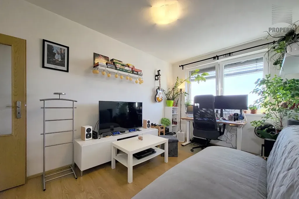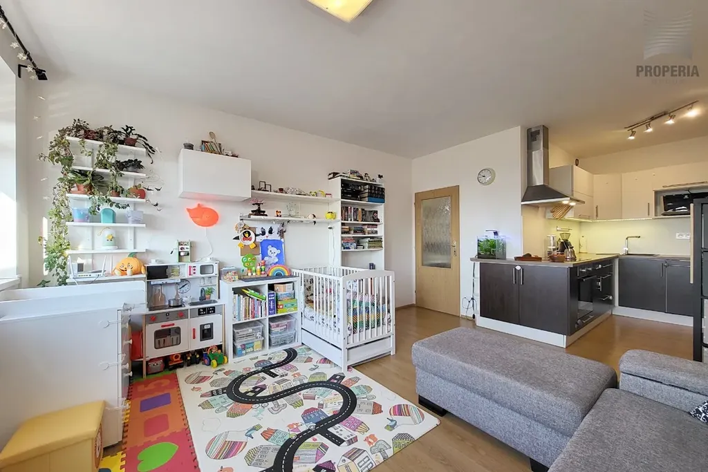 Obývací pokoj je propojen s kuchyňským koutem 23,55 m2 a vstupem na balkón 3,45 m2. Balkón je situovaný na jihozápad a poskytuje krásný výhled na Brno.