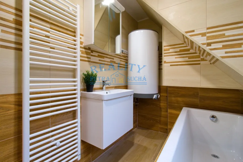 V koupelně se nachází vana, umyvadlo se skříňkou, zrcadlo s osvětlením a toaleta je vybavena závěsným WC systémem s podomítkovou nádržkou Geberit, který zajišťuje snadnou údržbu a čistý vzhled prostoru. Moderní obklady v přírodních tónech doplňují celkový svěží styl interiéru.