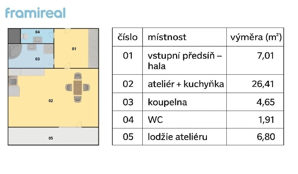K pronájmu nabízíme moderní ateliér 1+kk s lodžií, který bude k nastěhování od 1. 1. 2026.