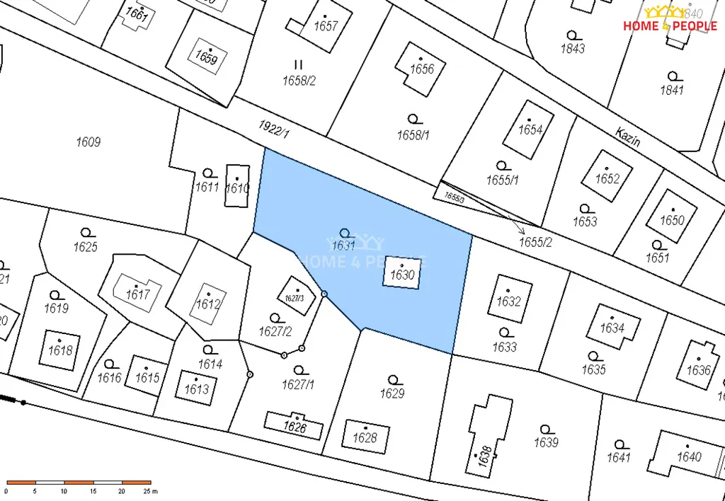 Pozemek má celkovou výměru cca 709 m², předmětem prodeje je tedy ideální polovina podílu.