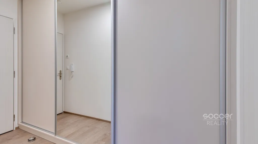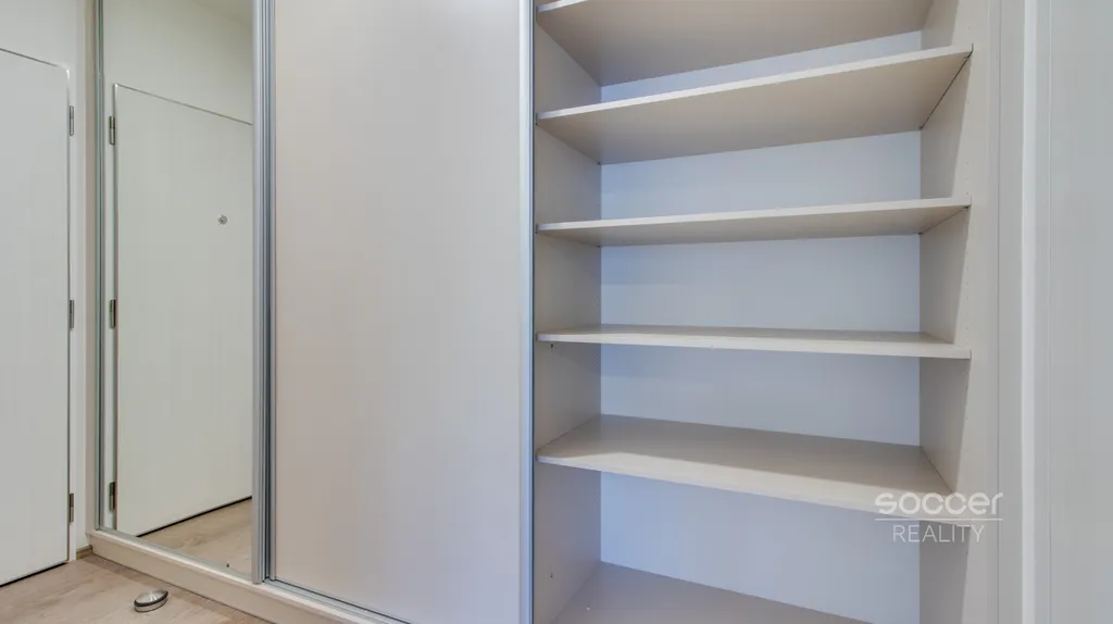 Byt je vybavený kuchyňskou linkou na míru se všemi spotřebiči včetně myčky, na chodbě jsou pak opět na míru vyrobené vestavěné skříně, které poskytují dostatek úložného prostoru. V koupelně pračka. Koupelna je se sprchovým koutem a WC dohromady.