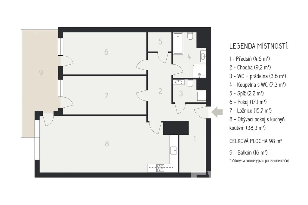 Exkluzivně Vám nabízíme moderní světlý byt o dispozici 3+kk s užitnou plochou 98 m2 s velmi prostorným balkonem 16 m2, vlastním garážovým stáním, sklepem a sklepní kójí o celkové výměře 7,5 m2.