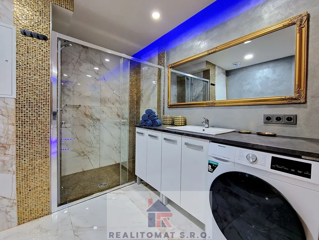 Wellness prostorná koupelna s vířivou hydromasaní vanou pro 2 osoby, led, sauna, sprchový kout.