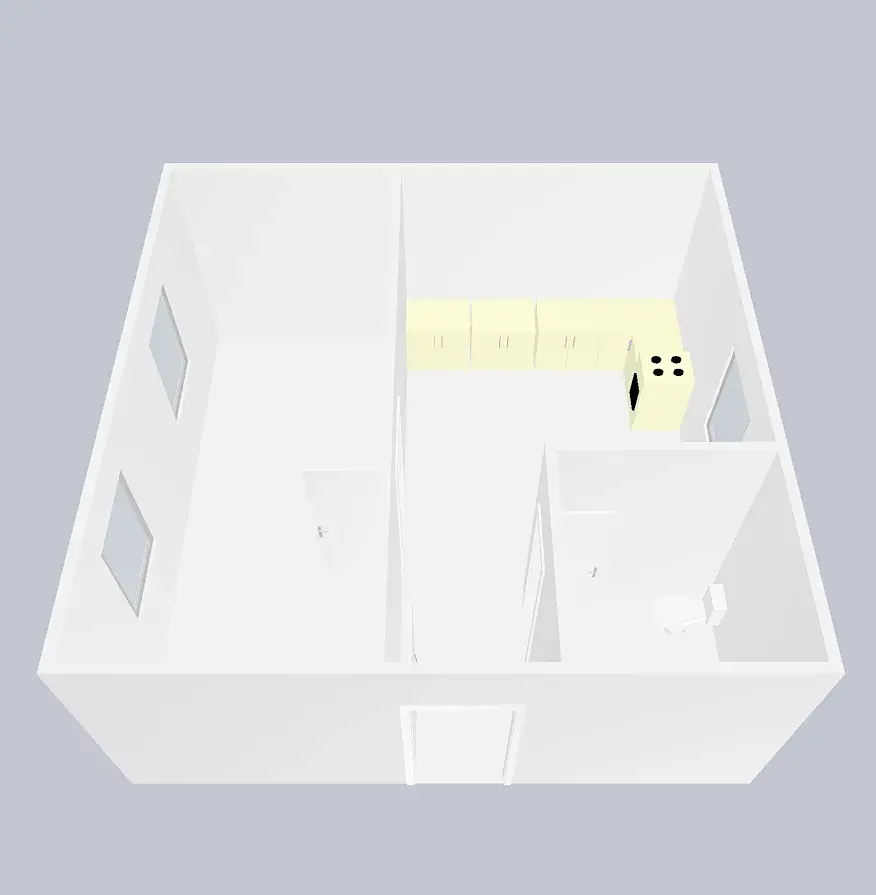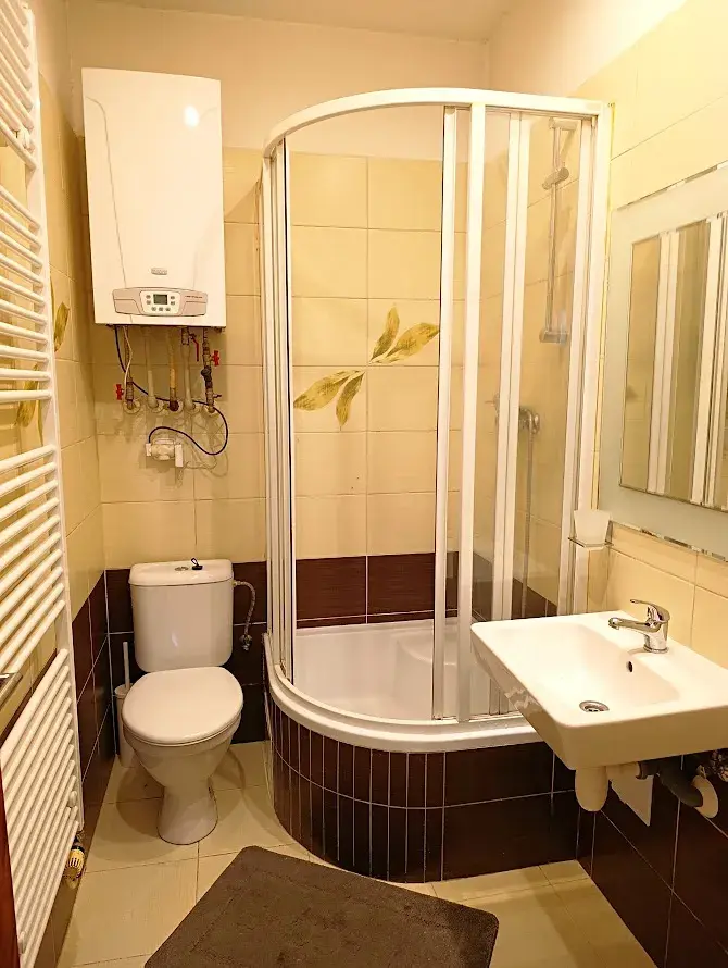 V kuchyni je nová kuchyňská linka se spotřebiči. V koupelně se nachází umyvadlo, sprochý kout, plynový kotel a toaleta.