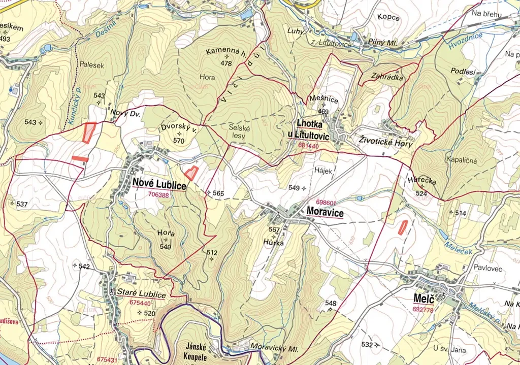 K prodeji je půda na pozemcích parc. č. 355, 1028 a 1032/3 zapsaných na LV 237 v katastrálním území Nové Lublice a na pozemku parc. č. 547/4 zapsaných na LV 506 v katastrálním území Melč.