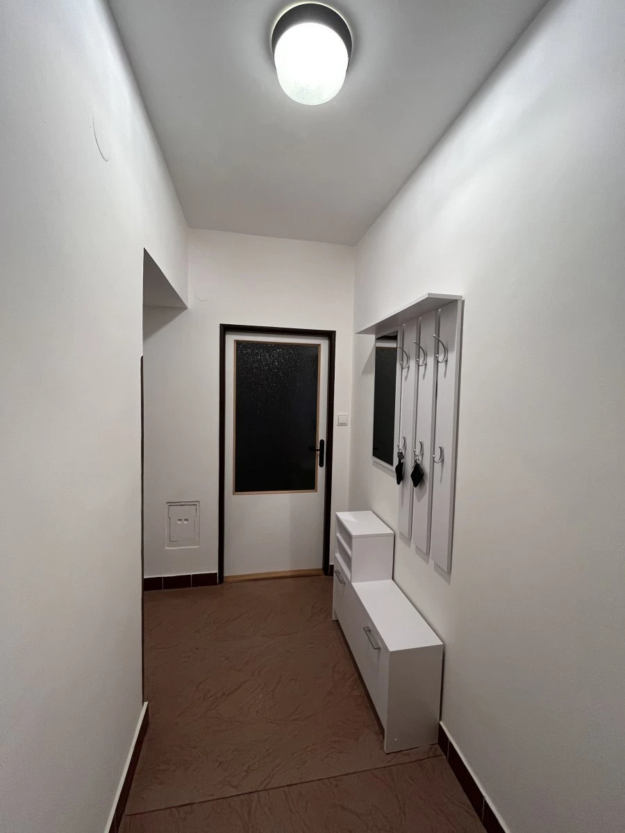 Koupelna je vybavena umyvadlem, sprchovým koutem a vestavěným úložným prostorem. Toaleta je samostatná. V chodbě se nachází šatní stěna s dostatkem úložného prostoru.