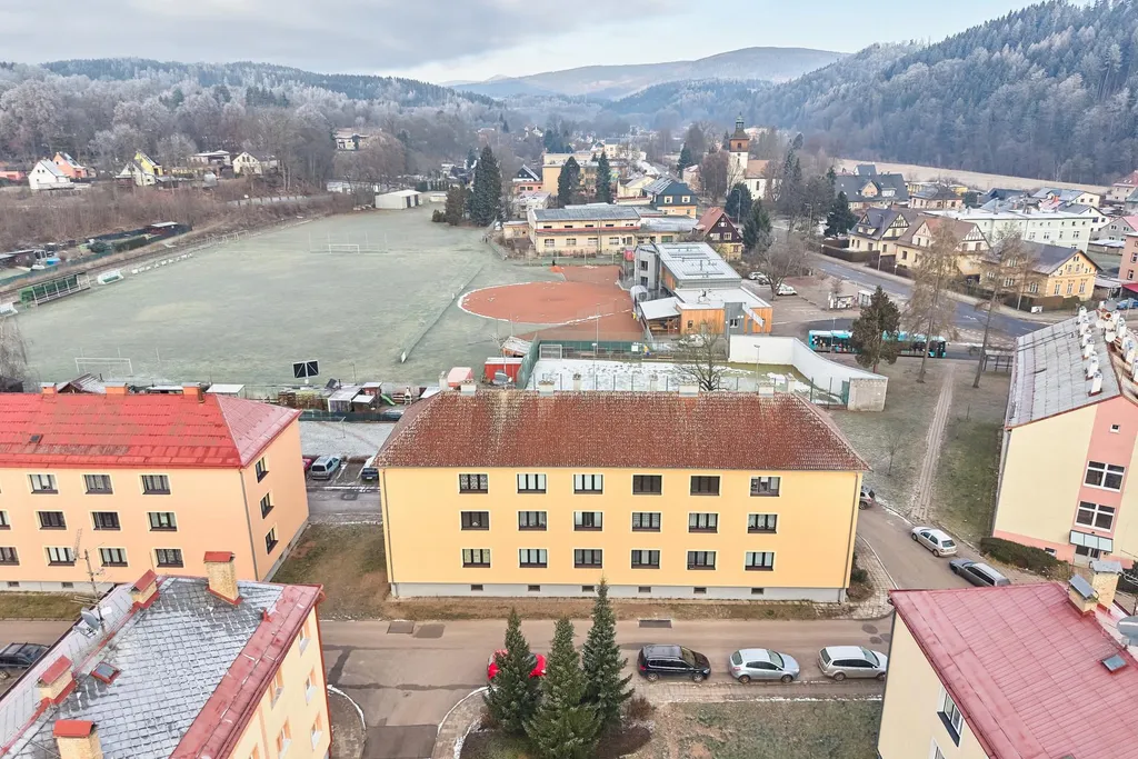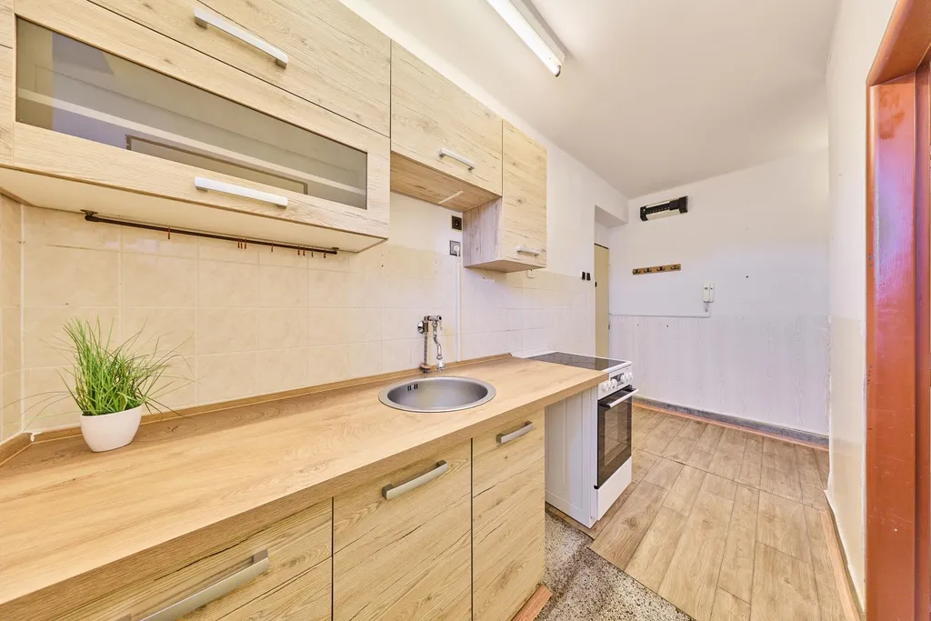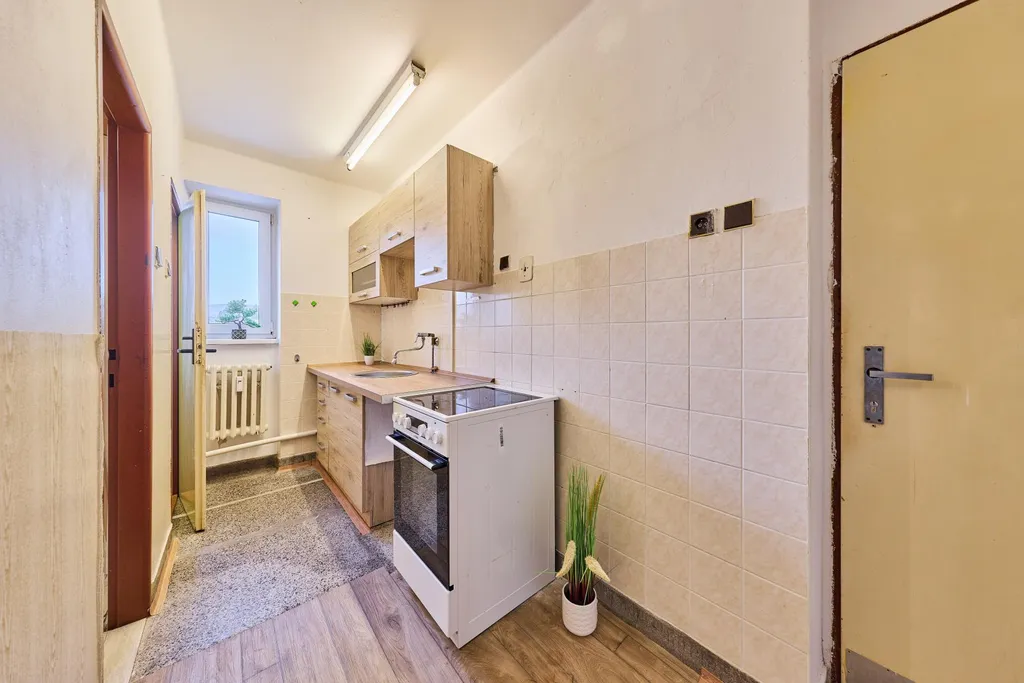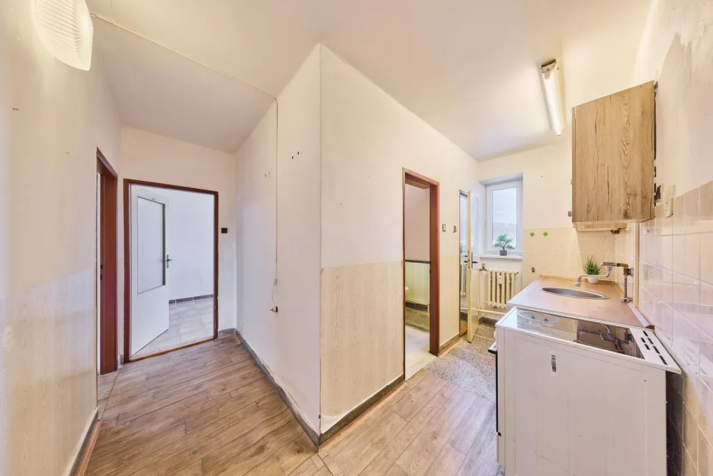 Byt je v osobním vlastnictví a nachází se ve 2. NP zděného třípodlažního bytového domu s výhledem na fotbalové hřiště v Horním Starém Městě. Byt je v původním, udržovaném stavu, má nová plastová okna, podlahy v bytě linoleum, dlažba, plovoucí podlaha a v obývacím pokoji jsou původní parkety. Majitelé vyřešili chybějící pokoj pro děti úpravou dispozice tak, že umístili kuchyňskou linku do prostorné chodby.