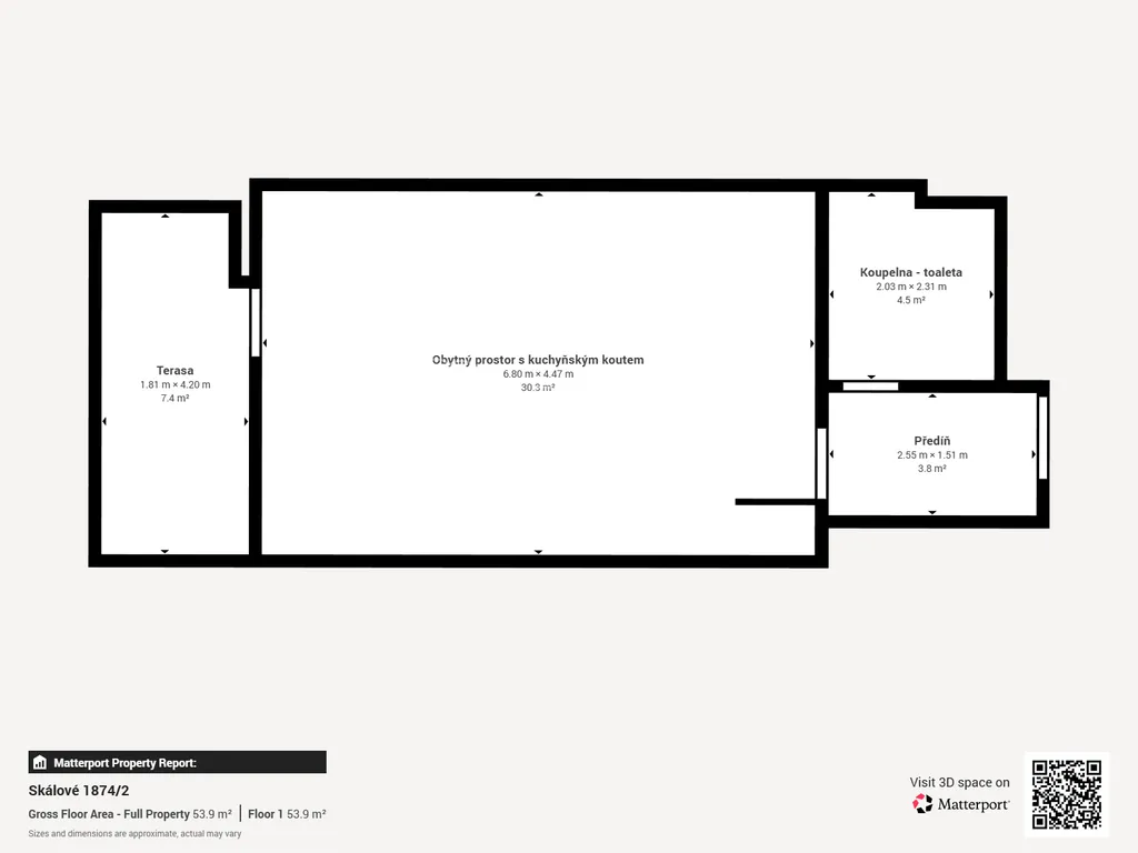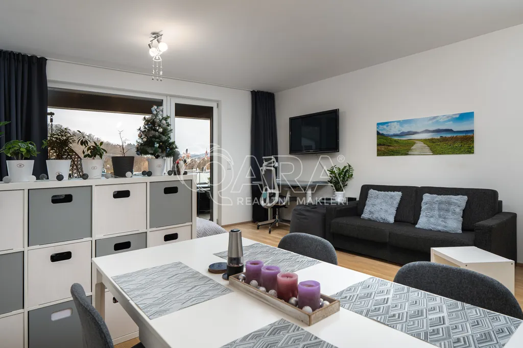 Vstupní chodba s vestavěnou skříní nabízí dostatek úložného prostoru. Dominantou bytu je velký obytný prostor, kde je kuchyňský kout prakticky oddělen od obývací části, díky čemuž byt působí vzdušně a otevřeně. Z obytné části je přímý vstup na terasu, ideální pro ranní kávu nebo večerní relax.