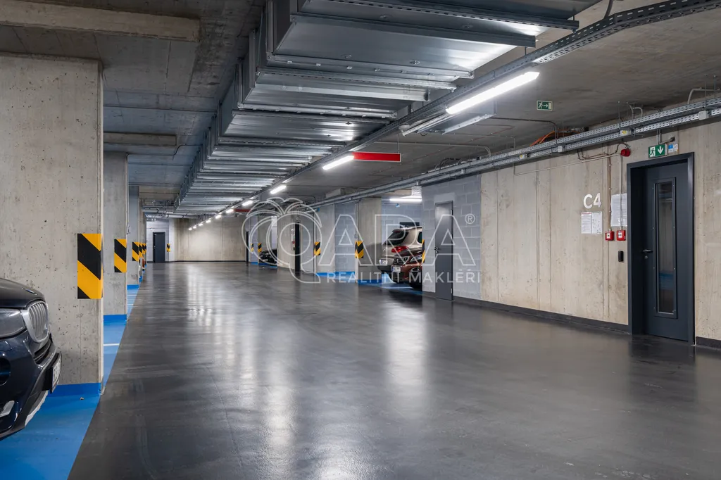 K bytu náleží také sklepní kóje, která je umístěna v garáži domu v blízkosti parkovacího stání, což zajišťuje pohodlný přístup a další praktický úložný prostor.