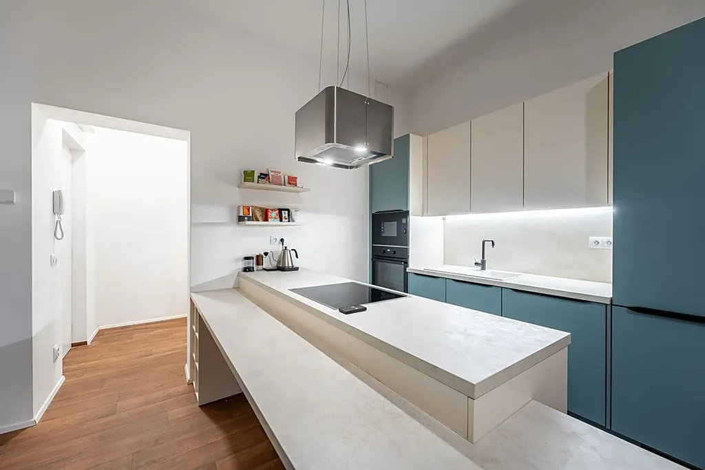 Je vybaven moderní kuchyňskou linkou s lednicí, mrazničkou, indukční varnou deskou, digestoří, elektrickou troubou, mikrovlnou troubou, myčkou a pračkou.