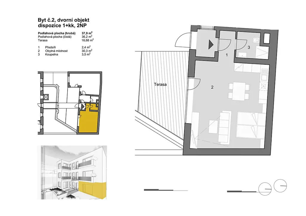 Byt orientován na jižní stranu se nachází ve dvorní části novostavby, tudíž zajišťuje naprosto nerušené bydlení.
