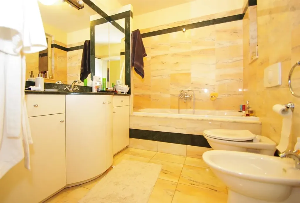 Interiér bytu dispozičně nabízí vstupní chodbu, prostorný obývací pokoj s balkónem, dále se vstupem do kuchyně vybavené spotřebiči (lednice s mrazákem, myčka, plynový sporák, trouba, mikrovlnná trouba). V protilehlé částí bytu jsou situované dvě samostatné ložnice orientované do vnitrobloku a dvě koupelny. Jedna z ložnic disponuje balkonem a vlastní koupelnou s vanou, toaletou a bidetem. Druhá koupelna má samostatný přístup a je vybavena sprchovým koutem, toaletou a bidetem. Součástí bytu je i samostatná prádelna s pračkou a sušičkou a samostatným topným systémem.