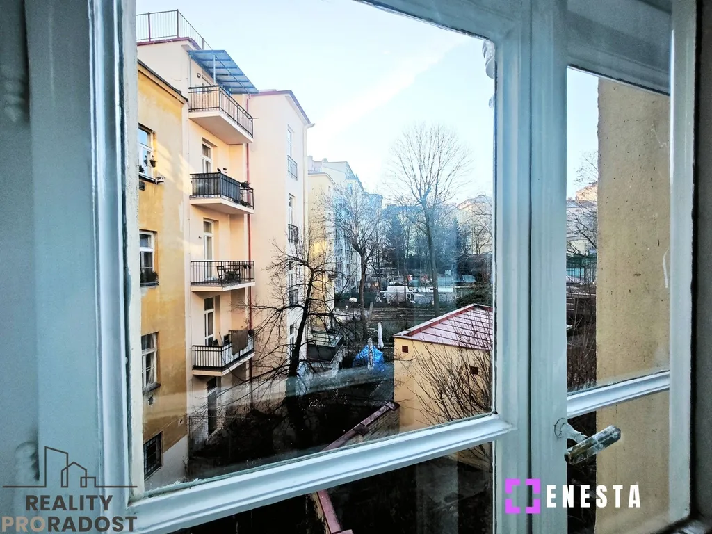 Jednotka nabízí kombinaci výhledu do ulice i do klidného vnitrobloku. Interiér tvoří renovované parkety a vysoké stropy typické pro klasickou zástavbu.