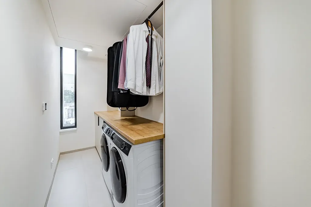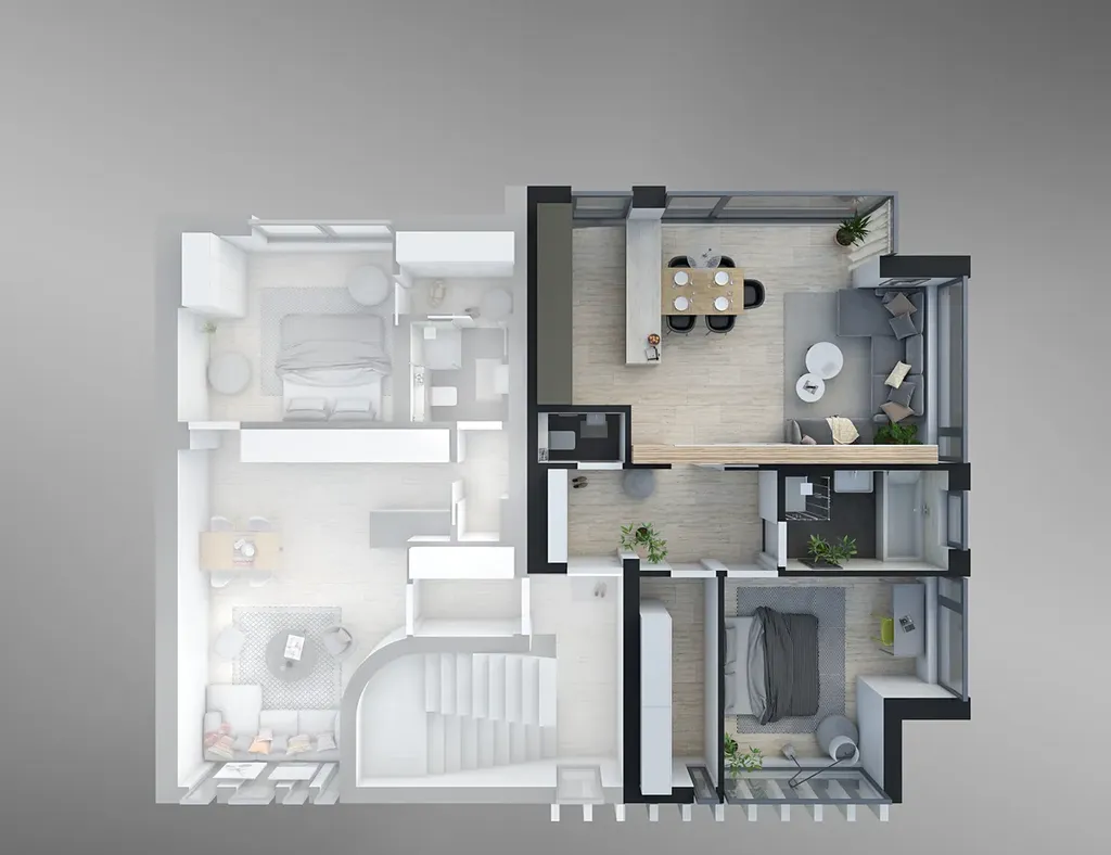 Byt o velikosti 67 m² s dispozicí 2+kk se nachází v 2. NP. Velkoformátová okna z obytné části kompenzují absenci terasy. Z těchto oken je výhled do zahrad. Uživatelskou přívětivost podpoří 4 samostatné místnosti příslušenství – zádveří, koupelna, WC a velká šatna s pračkou a sušičkou. Koupelna je vybavena sprchovým koutem, vanou a umyvadlem.