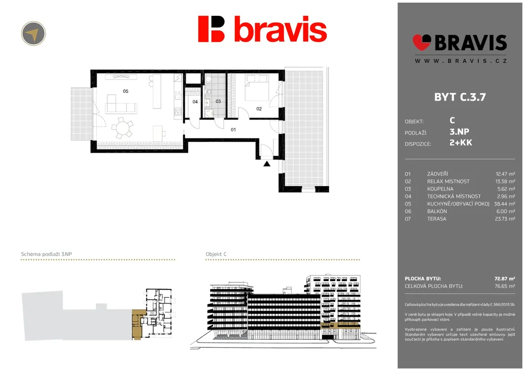 Bytová jednotka o celkové ploše 76 m² disponuje terasou 24 m², balkonem 6 m² a sklepem a je situována ve 3. nadzemním podlaží polyfunkčního domu na ulici Fuchsova, jen několik kroků od katedrály sv. Petra a Pavla či hradu Špilberk.