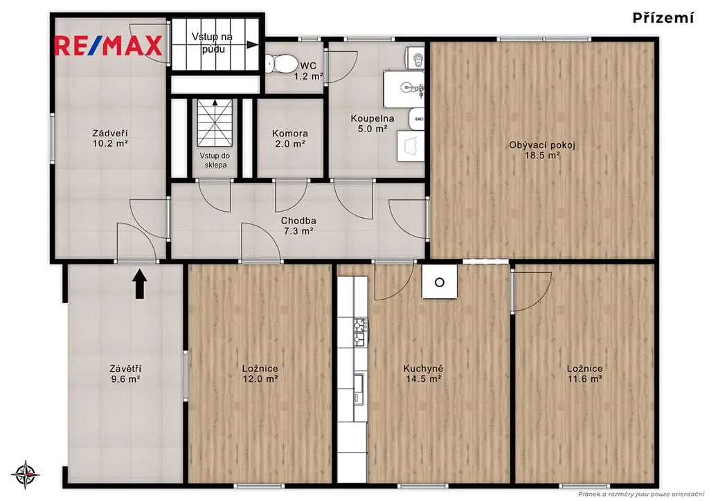V přízemí se nachází kuchyň, obývací pokoj, dvě ložnice, koupelna, samostatná toaleta, chodba a zádveří. Část domu je podsklepena sklepem 12 m² se vstupem z chodby. Velkou výhodou je prostorná půda o rozloze více než 80 m² s trámovými krovy a taškovou střechou Bramac, která nabízí možnost vestavby a rozšíření obytných prostor.