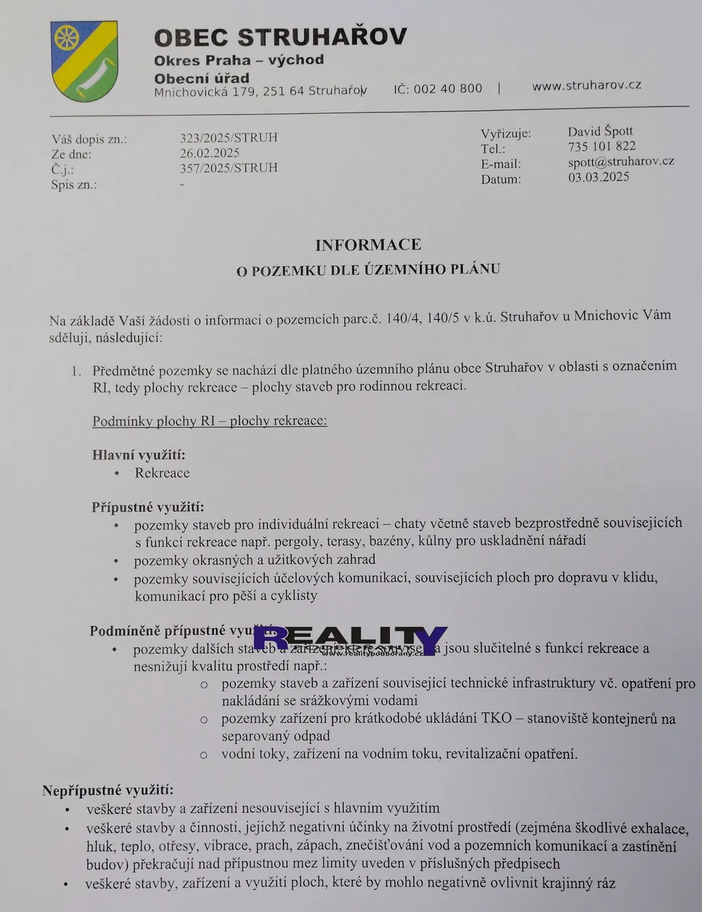 Předmětný pozemek se nachází dle platného územního plánu obce Struhařov v oblasti s označením plochy RI, tedy plochy rekreace - plochy staveb pro rodinnou rekreaci.