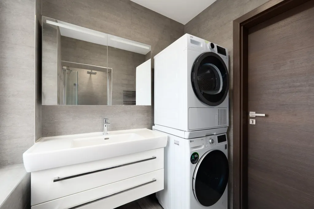 Koupelna je vybavena sprchovým koutem, kvalitní sanitou značky Laufen a jsou zde připravené rozvody na pračku i sušičku.