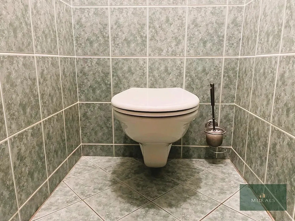 V koupelně je vana a koupelnová skříňka s umyvadlem, a skříňka na zdi. WC samostatné.