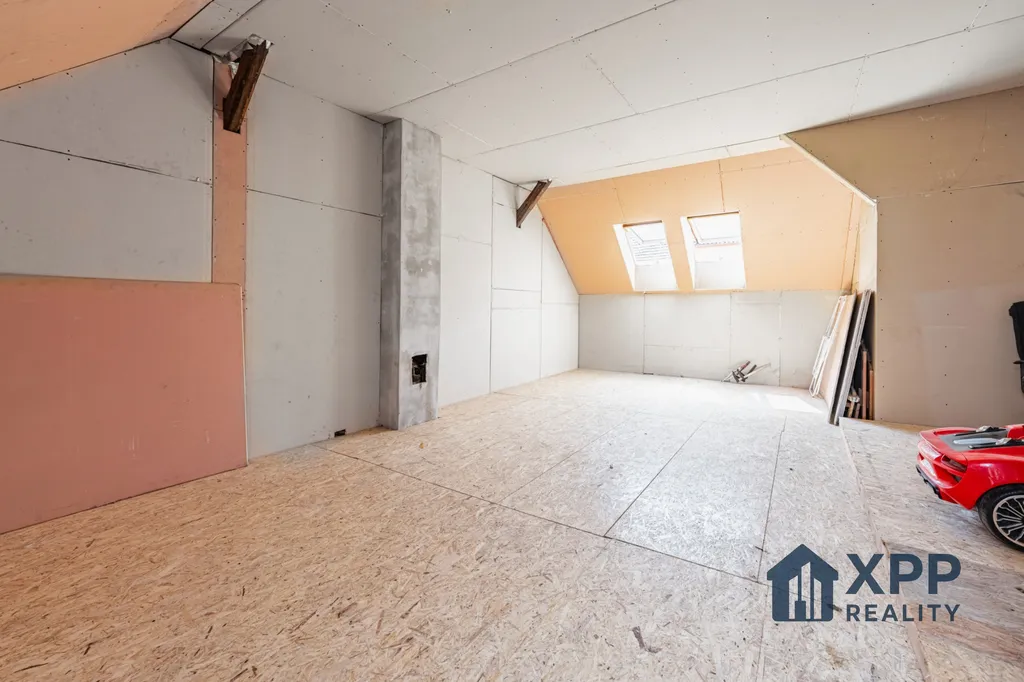 V prvním patře je započatá výstavba podkrovní garsoniéry s vlastní koupelnou a WC. Prostor je připraven k dokončení dle představ nového majitele. Podkroví (půdní prostor) má dle projektové dokumentace podlahovou plochu 52,14 m². Po dokončení je možné garsoniéru pronajímat přibližně za 9 000 Kč měsíčně + energie.