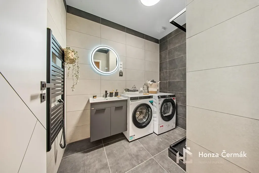 Rekonstrukce v bytě byla provedena kompletně. Nové rozvody elektřiny, vody, nové podlahy s lepeným vinylovým povrchem i moderní koupelna. Ta je vybavena elektrickým podlahovým topením, sprchovým koutem, elektrickým žebříkem a součástí vybavení je pračka i sušička. Samozřejmostí jsou bezpečnostní vstupní dveře, kamerový systém v domě a rozvody internetu po celém bytě.