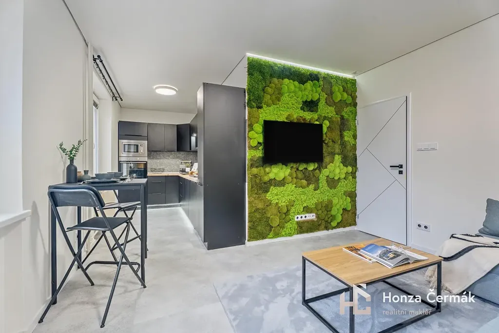 Interiér zaujme na první pohled svým moderním a nadčasovým pojetím. Betonové stěrky, bezúdržbové mechové dekorace, akustické panely a LED pásky zapuštěné v sádrokartonových podhledech vytvářejí výrazný, ale zároveň harmonický celek. Kuchyňská linka je plně zabudovaná a vybavená vestavnými spotřebiči včetně myčky, trouby a mikrovlnné trouby. Obývací pokoj i ložnice disponují zabudovanými televizemi, součástí prodeje je také sedací souprava. Byt je připravený k okamžitému užívání bez dalších investic.