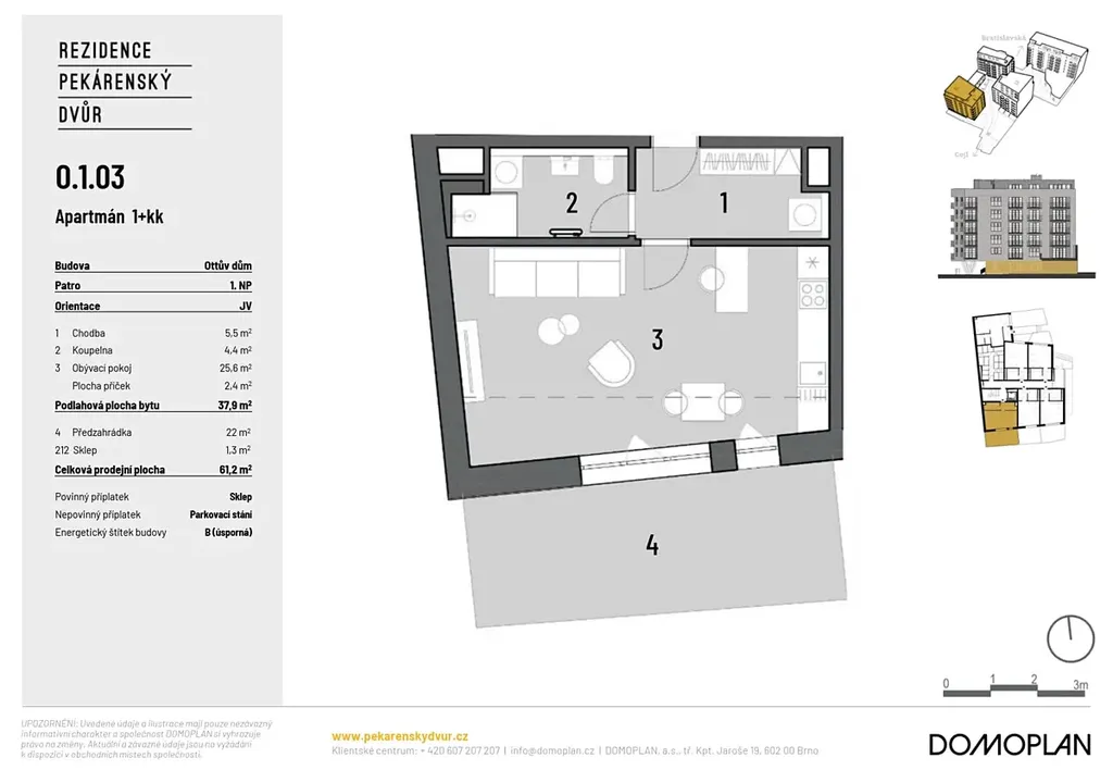 Nabízíme k prodeji moderně navržené jednotky 1+kk o celkové ploše 37,9 m2 s předzahrádkou o velikosti 22 m2. Dispozičně jsou jednotky řešeny obývacím pokojem s kuchyňským koutem, koupelnou se sociálním zařízením a předsíní.