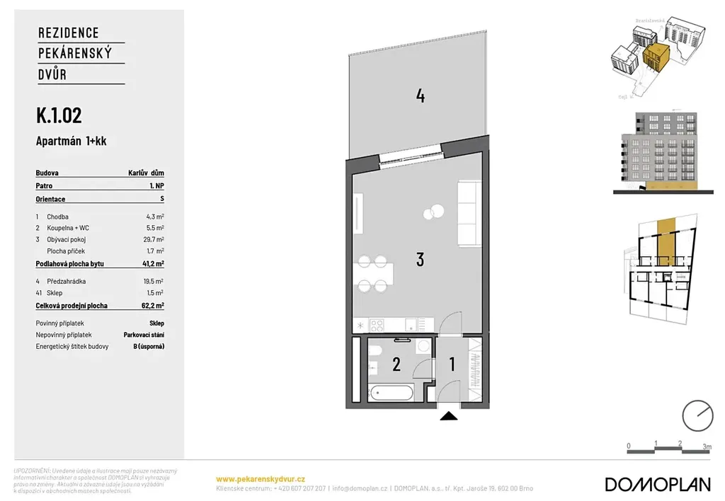 Nabízíme k prodeji moderně navržené jednotky 1+kk o celkové ploše 41,2 m2 s předzahrádkou o velikosti 19,5 m2. Dispozičně jsou jednotky řešeny obývacím pokojem s kuchyňským koutem, koupelnou se sociálním zařízením a předsíní.