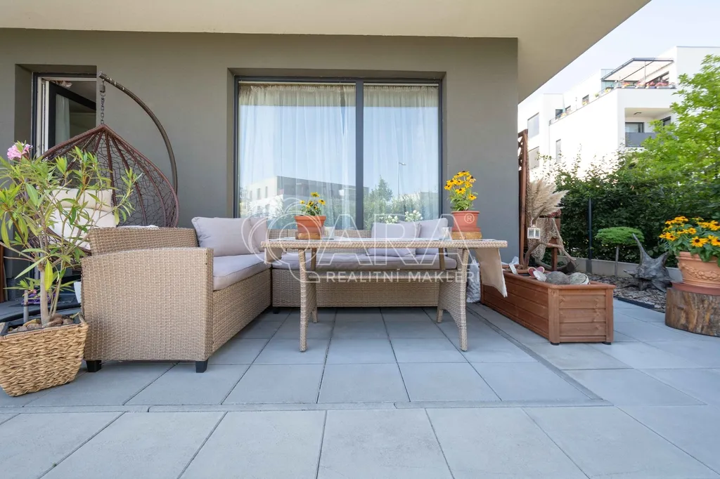 Dispozice bytu v přízemí zdařilé novostavby z roku 2021: vstupní chodba s vestavěnou skříní, ložnice, obývací pokoj s kuchyňským koutem a vstupem na terasu, koupelna s vanou a WC. Z vybavení na fotografiích zůstane jen část: kuchyňská linka včetně spotřebičů (indukční deska, el. trouba, vestavěná lednice s mrazákem, digestoř), dále zůstane šatní skříň v ložnici a sezení na terase.