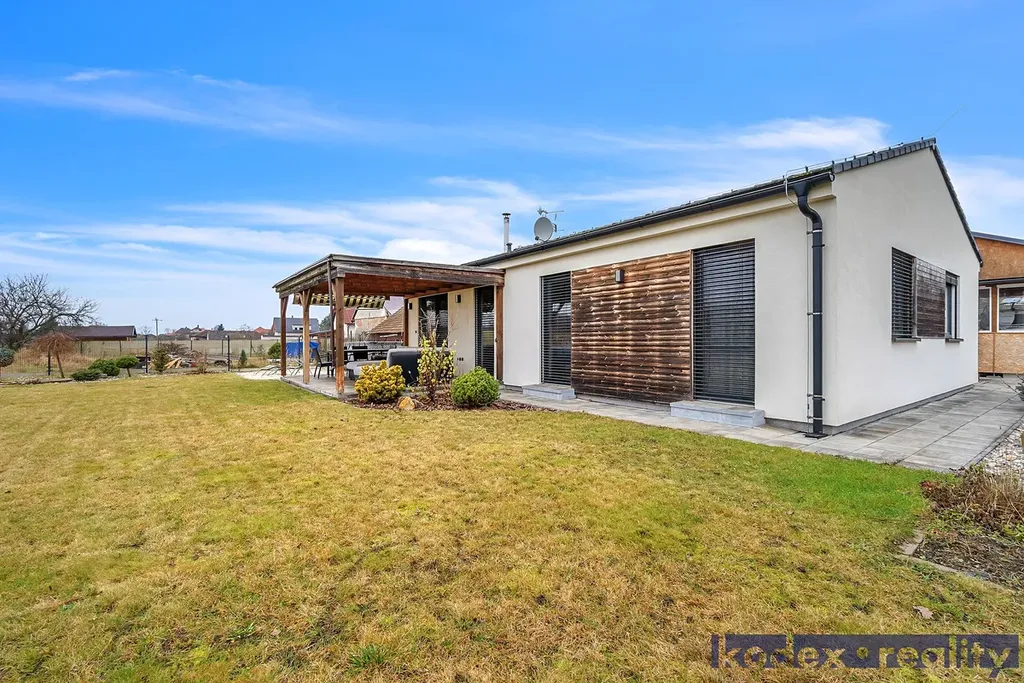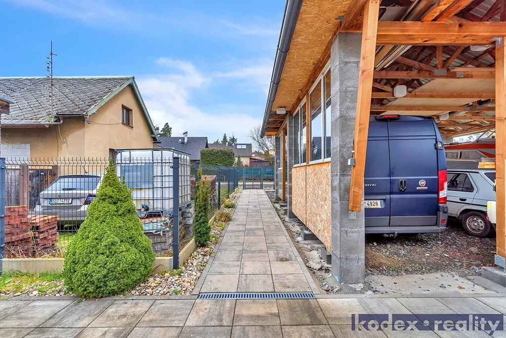 Dispozice: krytý vstup, zádveří s vestavěnou skříní a technickou místností, obytná místnost s kuchyňským koutem se spíží, chodba s přístupem na půdu, koupelna s vanou, sprchovým koutem a saunou, komora, ložnice, dětský pokoj a pracovna a krytá terasa. Vedle RD stojí dílna a sklad na kola, motorky apod. Před domem je postaveno velké garážové stání pro 2-3 auta včetně dodávky. Pozemek je kompéletně oplocen a vpředu je elektricky ovládaná vjezdová brána. Okrasná zahrada je vybavena zavlažovacím systémem, venkovní sprchou, bazeném a krytou terasou.