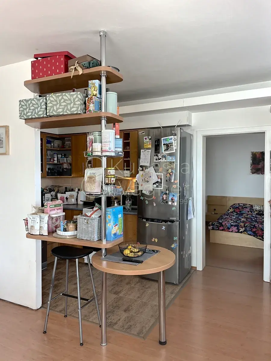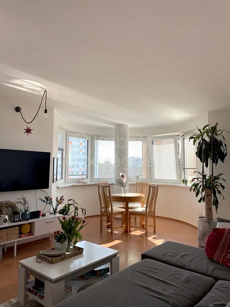 Z chodby se pak dostáváme do obývacího pokoje, kde se v levé části nachází kuchyňský kout s myčkou nádobí, varnou deskou, digestoří a samostatně stojící lednicí. Samotný obývací pokoj má v centrální části prostor pro odpočinek; vlevo vzadu pak jídelní stůl v půlkulaté částí pokoje. Okna jsou zde situována na východ, jihovýchod. Prostorná ložnice s vestavnou skříní je aktuálně využívána z části pro spánek a z části jako pracovna. Z ložnice je také vstup na balkon, ze kterého je krásný výhled na Labe a Kunětickou horu.