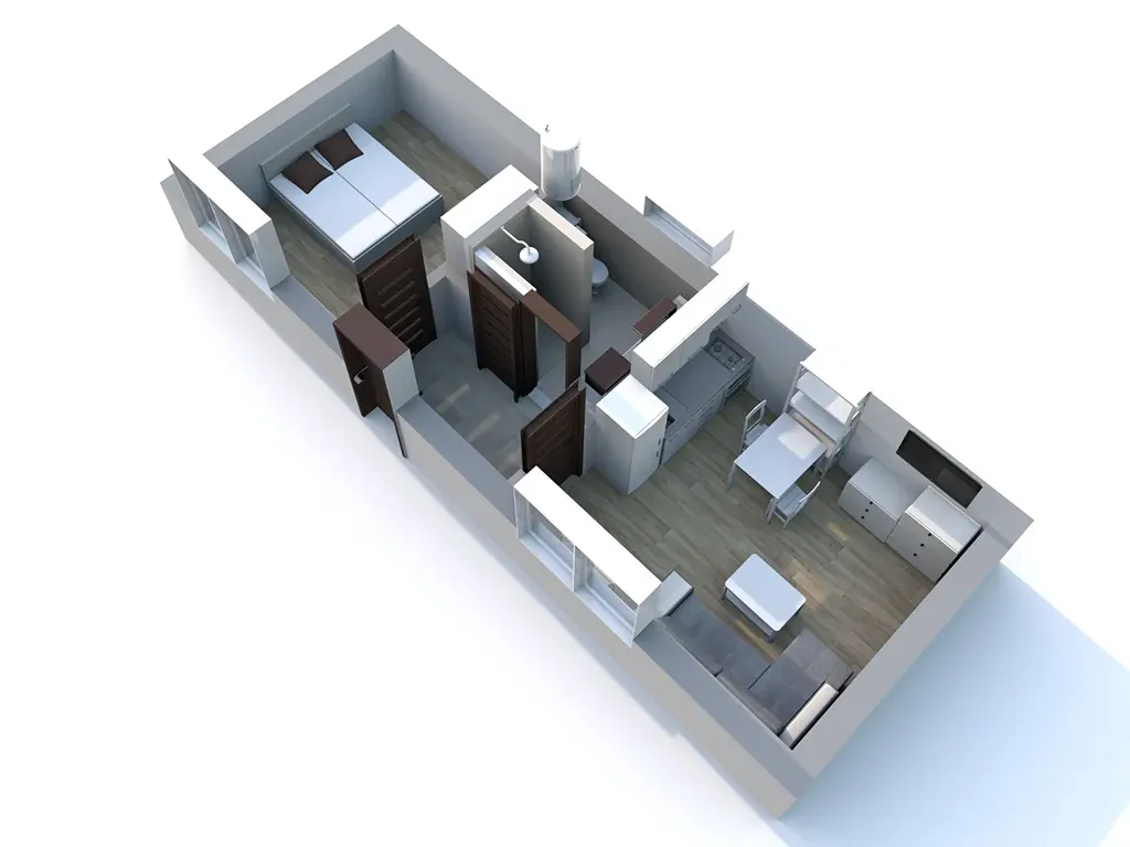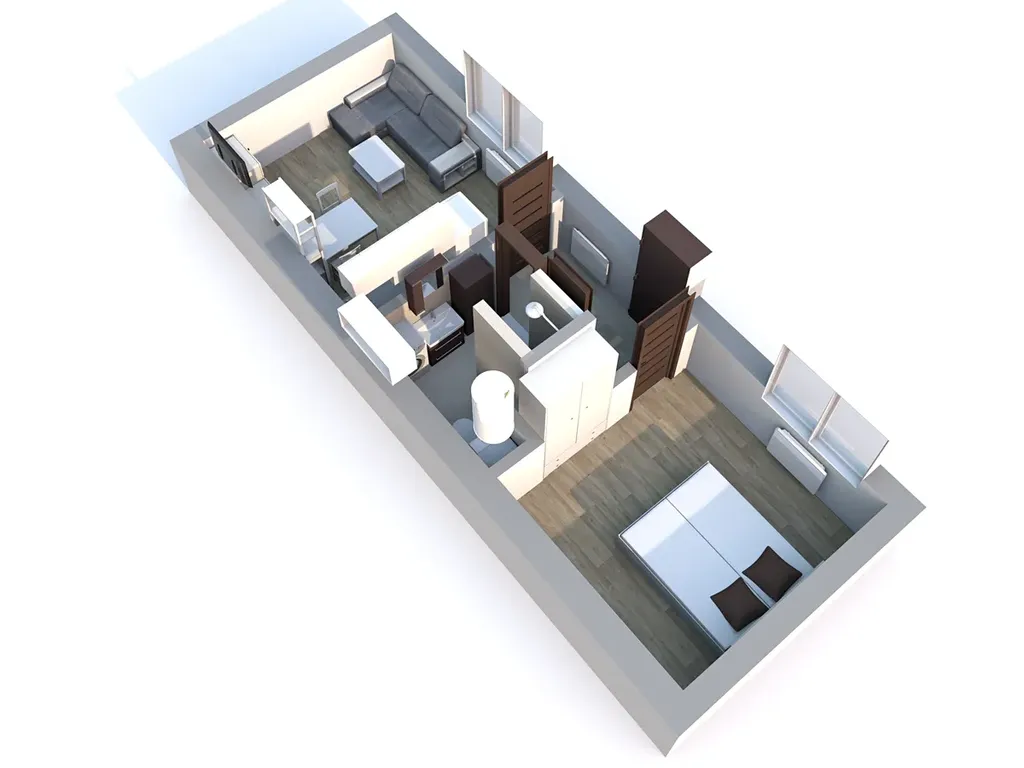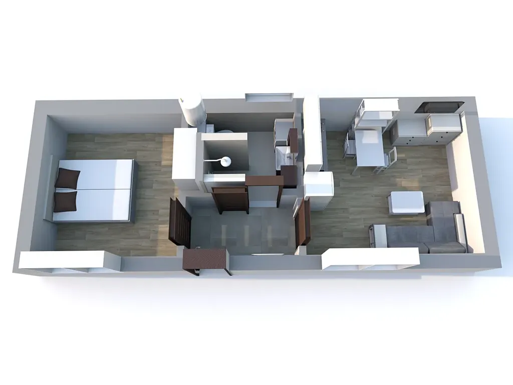 Dispozice 2kk má samostatnou ložnici a obývací pokoj s kuchyňským koutem, uprostřed je koupelna se sprchovým koutem a WC.