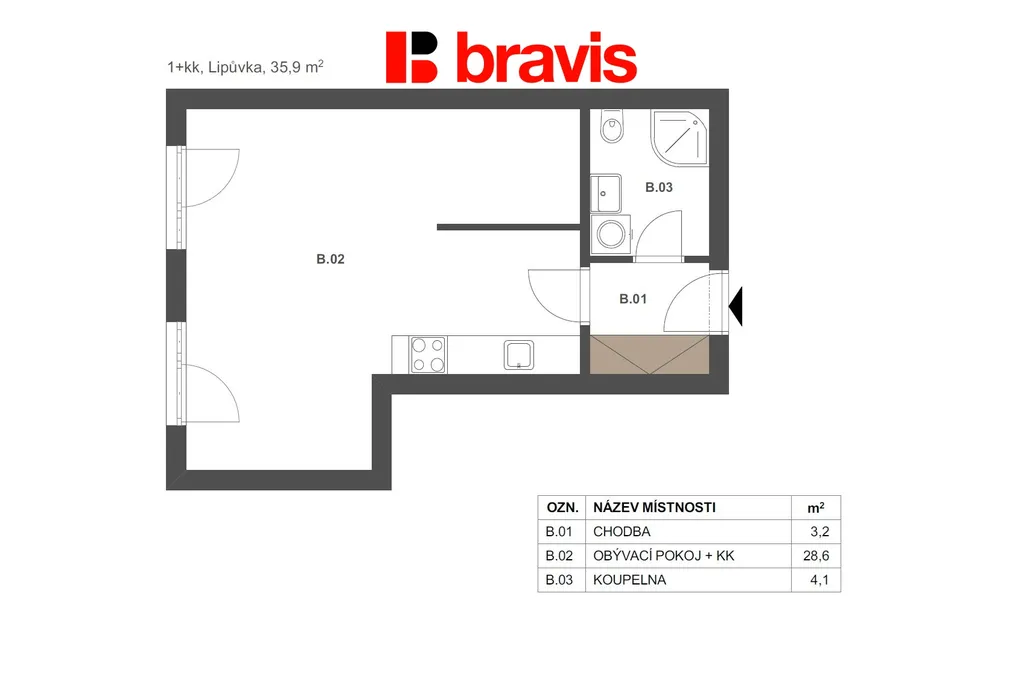 Ve výhradním zastoupení developera nabízíme k prodeji novostavbu bytu o dispozici 1+kk (2B) a užitné ploše 35,9 m² v obci Lipůvka u Brna. Byt nabízí prostoný obývací pokoj s kuchyňským koutem o vel. 28,6 m², chodbu, která nabízí dostatek prostoru pro vestavěný nábytek (3,2 m²) a koupelnu (4,1 m²).