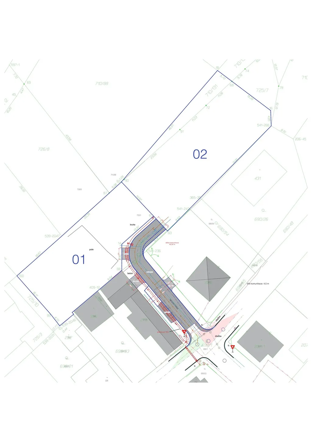 • zpevněnou příjezdovou komunikaci na hranici pozemku (zámková dlažba / živice)