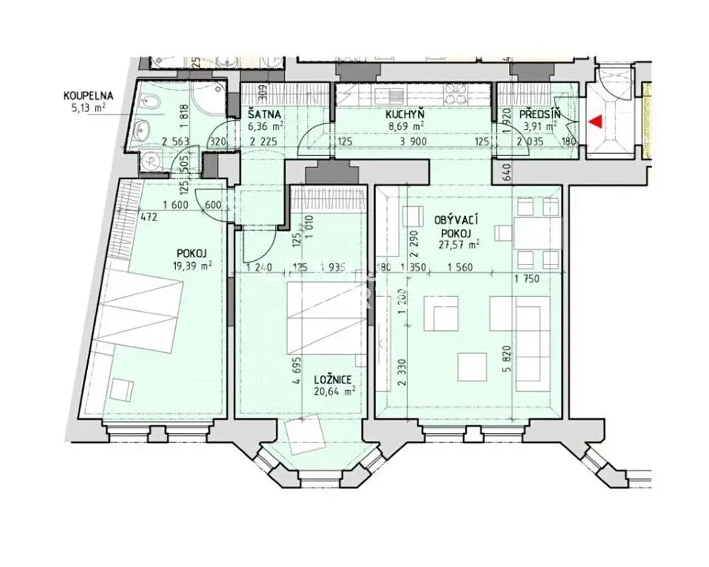 Byt je nezařízený a součástí vybavení jsou vestavěné skříně a plně vybavený kuchyňský kout.