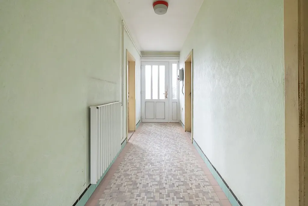 K hlavnímu vchodu domu vede malá oplocená předzahrádka. Po vstupu do chodby se vpravo nachází pokoj o výměře 20,6 m², vlevo kuchyně o velikosti 17,1 m². Z kuchyně je přístup do koupelny (3,66 m²), případně lze pokračovat do ložnice (20,6 m²). Chodbou projdete na prostornou prosklenou verandu (23 m²) s výhledem do dvora. Z verandy vedou dveře vpravo do průjezdu, vlevo pak do druhého, zastavěného křídla domu. To tvoří tři technické místnosti propojené prosklenou chodbou: první (12,2 m²), pravděpodobně využívaná ke zpracování masa, druhá (7,4 m²) s původním plynovým kotlem a třetí (13 m²) sloužila jako sklad. Na konci chodby se nachází samostatné WC (1,5 m²). Odtud se dále prochází na dvůr, kde se nachází chlév (12,6 m²) a prostorná zastřešená kůlna s udírnou.