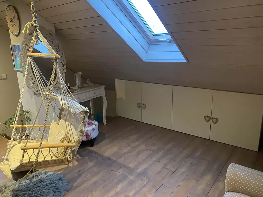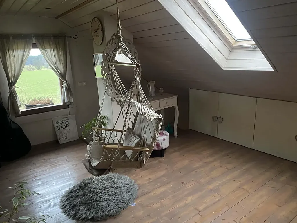 V přízemí se nachází šatna, koupelna s prostornou vanou a WC, obývací pokoj s kuchyní v provensálském stylu a pracovna/jídelna. V patře jsou dva pokoje.