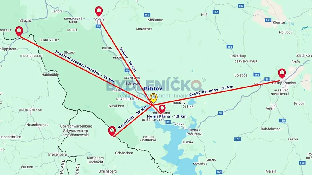 Pozemek se nachází v ideální vzdálenosti od významných regionálních center – např. České Budějovice – 55 km, Český Krumlov - 31 km, Praha - 180 km. Zajímavou dostupnost má hraniční přechod Strážný – 35 km i hraniční přechod do Rakouska Zvonková/Schöneben – 10 km.
