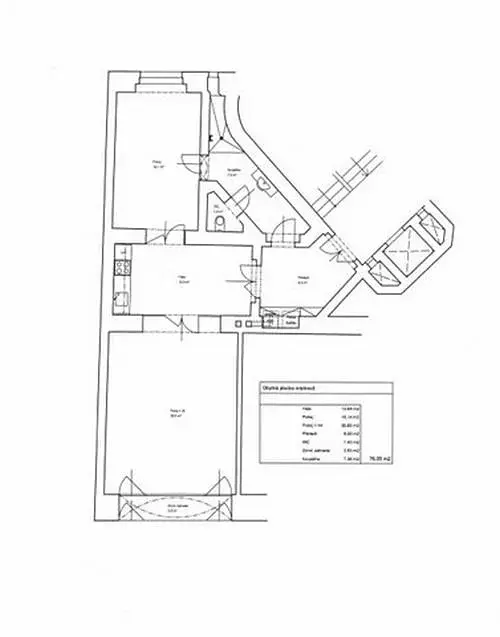 Prostory se nachází v 1.patře s výtahem. Celková plocha činí 76 m2 a sestává ze předsíně, haly s kuch. koutem, 2 místností (větší disponuje navíc zimní zahradou), koupelny a WC. Na podlaze je teraco.