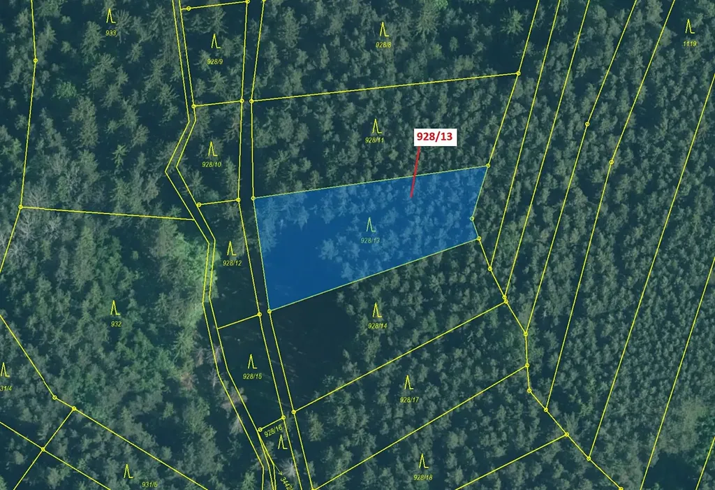 Lesní pozemek o výměře 1803 m2, parcelní číslo 928/13, podíl 1/1, katastrální území Hosty, obec Hosty, obec s rozšířenou působností Týn nad Vltavou, okres České Budějovice, Jihočeský kraj. Po těžbě.