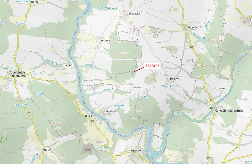 Lesní pozemek o výměře 1735 m2, parcelní číslo 3288/95, podíl 1/1, katastrální území Hosty, obec Hosty, obec s rozšířenou působností Týn nad Vltavou, okres České Budějovice, Jihočeský kraj. Po těžbě.