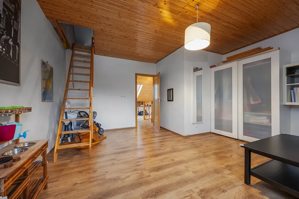 - Dispozice 5+kk, přízemí: vstup, technická místnost, WC pro hosty, vstup do jídelny a kuchyně, která je z části propojená s prostorným obývacím pokojem a vstupem na zastřešenou terasu s venkovním sezením , ložnice (pokoj pro hosty), koupelna, schodiště do patra : chodba, ložnice, dětský pokoj s půdičkou (možnost spaní), pracovna ( dětský pokoj), koupelna s WC.