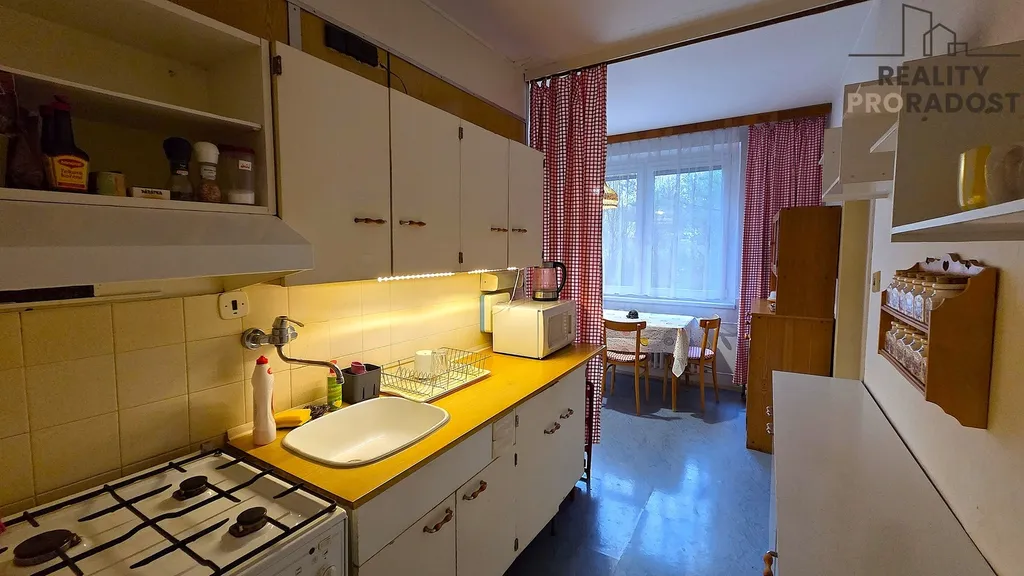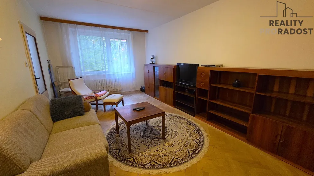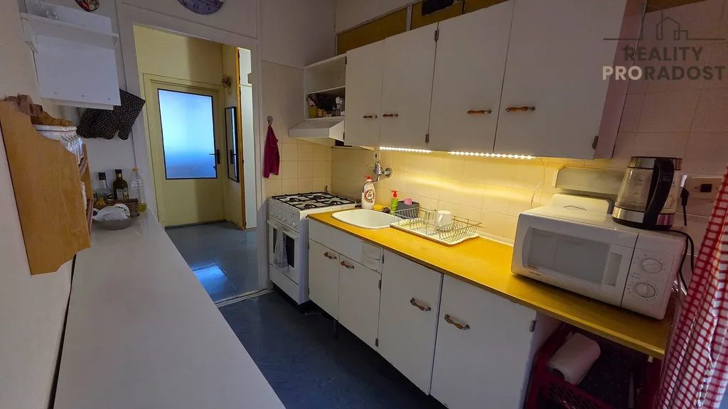 Vstupem do bytu se dostáváme do centrální chodby s vestavěnými skříněmi odkud lze pokračovat do 2 ložnic, obývacího pokoje, na WC a do kuchyně, ze které je přístupná koupelna. Ohřev vody a vytápění je centrální pro celý dům. Byt bude ke dni předání vyklizený a bíle vymalovaný. Zůstává kuchyňská linka, sanitární zařízení, mikrovlnná trouba, automatická pračka a většina nábytku z přiložených fotografií.