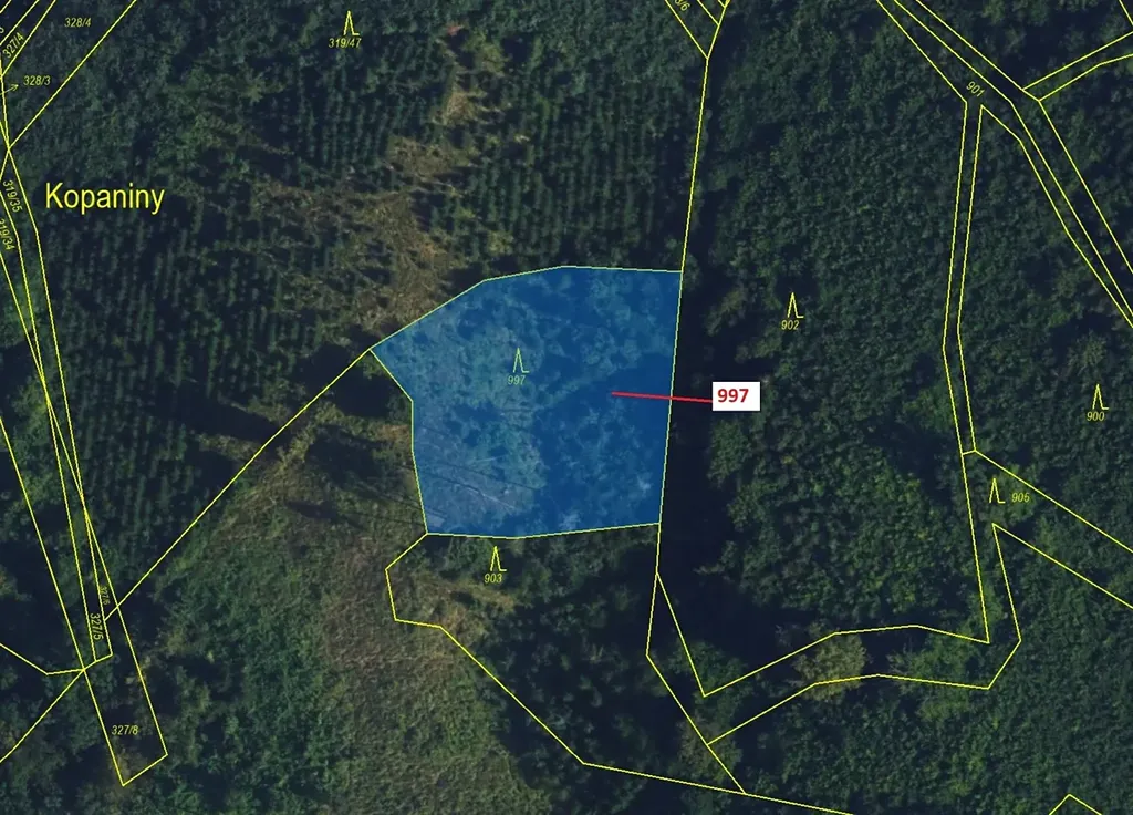 Lesní pozemek o výměře 1938 m2, parcelní číslo 997, podíl 1/1, katastrální území Lhota Rapotina, obec Lhota Rapotina, obec s rozšířenou působností Boskovice, okres Blansko, Jihomoravský kraj. Po těžbě.